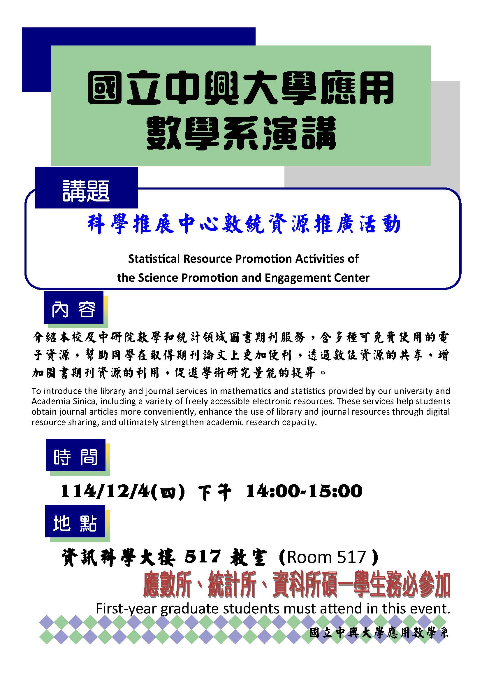 應數所、統計所、資科所碩一學生務必參加